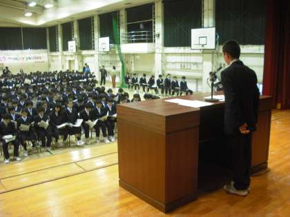 6時間目は生徒会本部役員による全校での生徒会オリエンテーションでした。駒沢中学校での生活のきまりや生徒会組織や専門委員会について、本部役員と後期専門委員長が説明しました。(副校長)