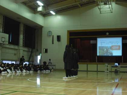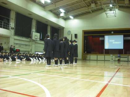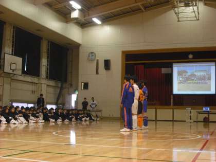本日は、吹奏楽部・卓球部・文芸映画研究部・JRC部・家庭科部・手話部・茶道部・美術部・サッカー部・男子バレーボール部・女子バレーボール部・バドミントン部・工作写真部・英語部・男子バスケットボール部・女子バスケットボール部・陸上競技部・剣道部・野球部の順で発表しました。写真は茶道部・美術部・サッカー部の発表です。(副校長)