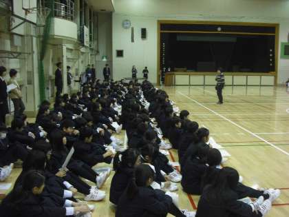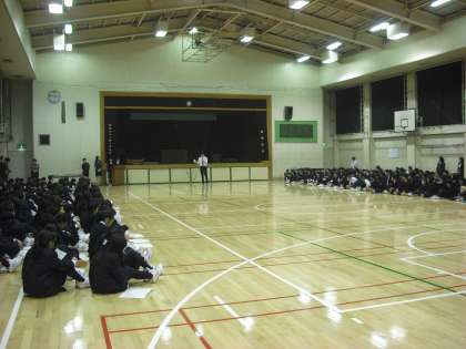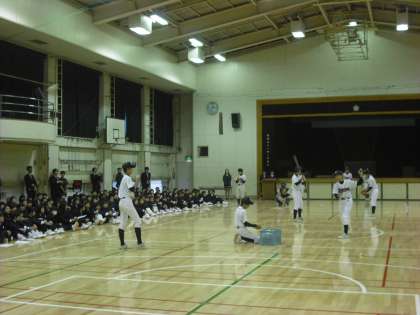 部活動紹介で、WBGTを提示してもらいながら熱中症予防の健康管理についての話、部活動で怪我をしたときの健康センターの申請について説明がありました。また避難訓練として、避難経路のことや避難後のことなど安全防災担当の栗山先生からお話しがありました。写真は野球部の発表、説明の様子です。(副校長)