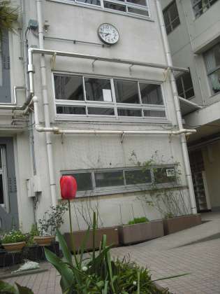 4月13日(月)今日の天気予報は雨です。まだ降っていない中庭でチューリップが一輪、生徒の登校を待っています。格技室では卓球部が朝練習をやっています。今週もがんばりましょう。(副校長)