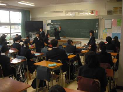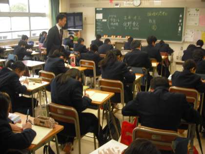 休み時間、日直は黒板の清掃をしています。授業の準備をしている生徒もいます。みんな次の授業の準備をしています。数学の授業では学習ノートなど副教材を配布しました。さっそく計算問題に挑戦!みんな集中しています。(副校長)