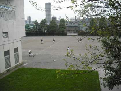 今日も雨の予報ですが、朝はまだ降っていません。校庭では野球部が朝練習をしていました。昨日の雨で桜もピンクから緑へ模様替えです。(副校長)