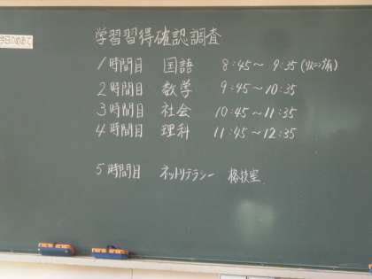 昨日とはうってかわっていい天気。部活の朝練習も活発です。今日は学習習得確認調査です。黒板にはすでに今日の予定が記入されています。さぁ実力を発揮してがんばりましょう。(副校長)