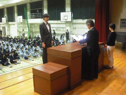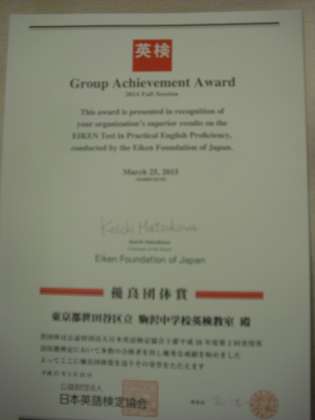本校英検教室が英語検定「優良団体賞」を受賞しました。これは参加者多数で成績が非常に優秀な団体が受賞するものです。本校英語科を代表して片桐先生が校長先生から表彰状を受け取りました。