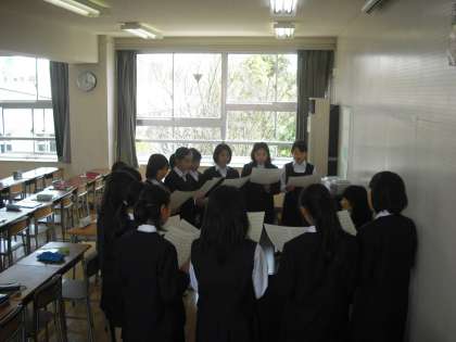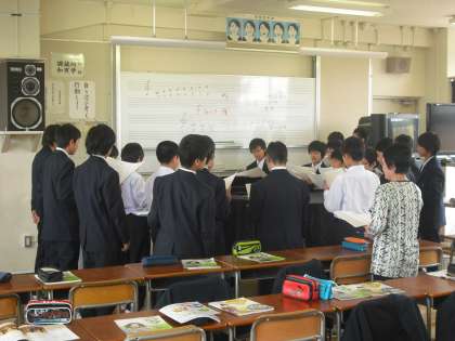 4階の音楽室では1年生が音楽の授業でした。男子と女子のパートに分かれて校歌の練習をしています。それぞれのパートで先生が指導していました。1年生は大きな声でハーモニーを響かせていました。(副校長)