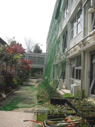緑のカーテンの設置が行われました。コンテナの土を入れて換えて、屋上からネットまでカーテンネットを設置しました。植えた苗が成長して緑の景色が登場するのは夏くらいとのことです。(副校長)