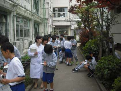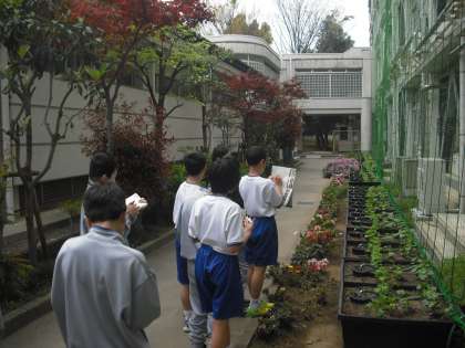 1年生は植物の生活と種類です。校内を巡って植物の観察をしていました。それにしても駒沢中学校にはさまざまな植物がありますね。きっと植物たちもみんなに観察してもらえて喜んでいると思いますよ。 (副校長)