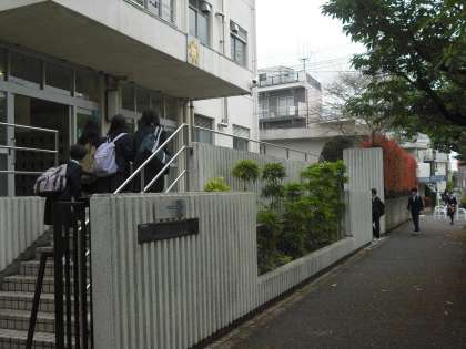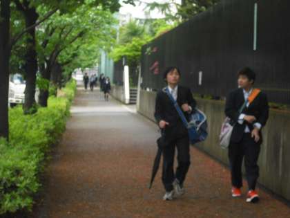 談笑しながら、または考えごとをしながら今日も生徒が登校してきます。頭上の桜並木もすっかり緑色に衣替えですね。今日も一日がんばりましょう。(副校長)