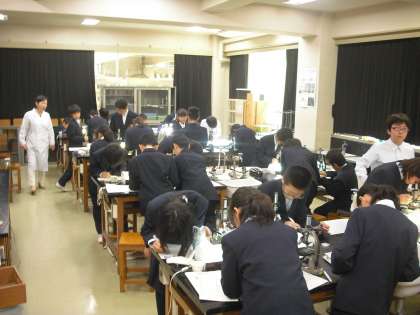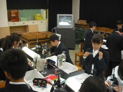 本校の理科室は体育館棟の一階です。今日は1年生の理科の授業、顕微鏡を使って水の中の微小な生物の観察です。理科の教員が2名体制で生徒の実験のサポートをしています。動いている様子は観察できましたか?(副校長)