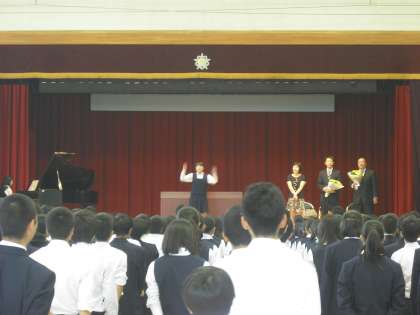 入場の際は花道をつくり拍手でお迎えしました。また最後に校歌を歌ってお送りしました。駒沢中学校の校歌が体育館いっぱいに響きわたりました。離任された先生方に生徒全員の気持ちがしっかり伝わった式になりましたね。(副校長)