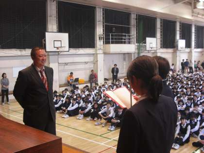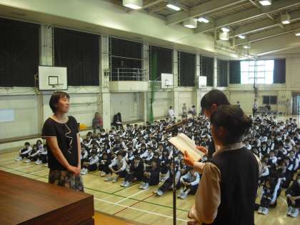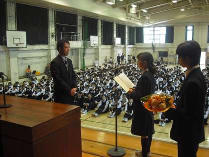離任式では3名の先生方へ代表生徒が作文と花束を渡し、先生方から挨拶をいただきました。先生方の挨拶を生徒全員が真剣なまなざしで聞き入っていました。みんなの気持ちはきっと壇上の先生方に届いたことでしょう。(副校長)