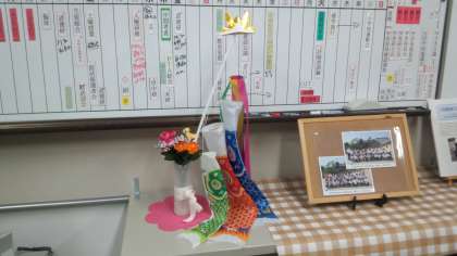さあ明日からGW5連休です。写真の鯉のぼりは校長室に飾ってあります。竿の先端の「黄金の兜(かぶと)」は市川先生が折ってくれました。