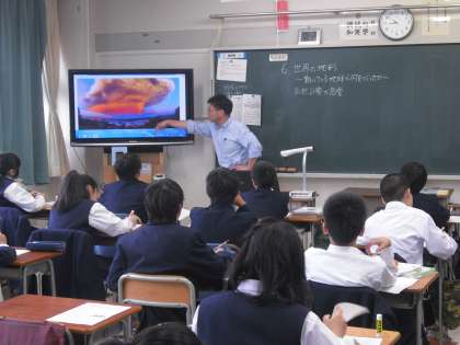 川原先生の授業では地図や写真を電子黒板を活用して大きく写しだしたりしています。