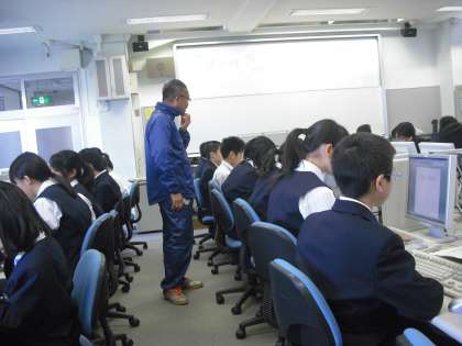 Wordで自分が書いた自己紹介文を打っています。1200字をローマ字入力しています。教室にキーボードをたたく音が響きます。水田先生が励ましの声かけをする中、気合いを入れて取り組む1年D組でした。(副校長)