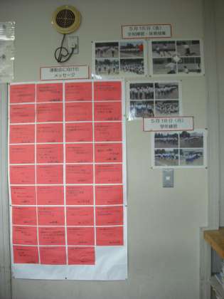 昨日の学年練習の様子が掲示してありました。担任の田村先生からのコメントが添えられていました。「「誰かやってくれるからいいや」ではなく、自分からやってみるという考え方ももってほしいと思います。体育委員に協力して、すばらしい取り組みしよう。」これから運動会練習でよいところを伸ばしていってくださいね。のびしろありますからね、みんなには。(副校長)