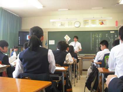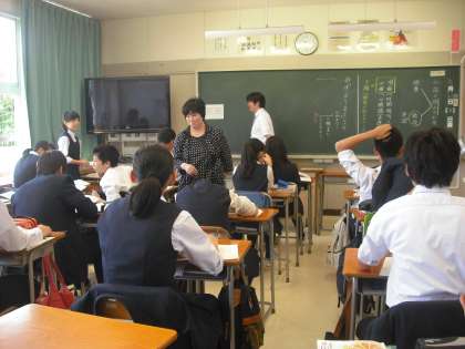 教育実習がスタートして4日目、2年生の国語では実習生が授業をしています。みんなは実習生先生の話を聞いて、文章読解をすすめます。理由を文字数制限ありで答える課題に取り組んでいます。(副校長)