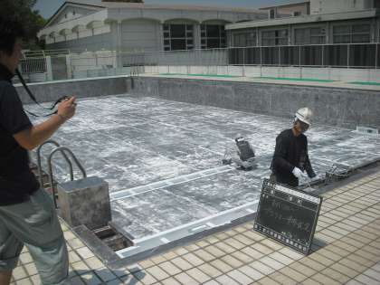 プールの塗装改修工事は、塗装面の剥離を終了いたしました。今週から来週にかけて、塗装行工程に入っております。地域のみなさま、引き続き、工事へのご理解とご協力をお願いいたします。(副校長)