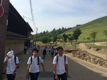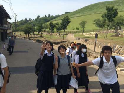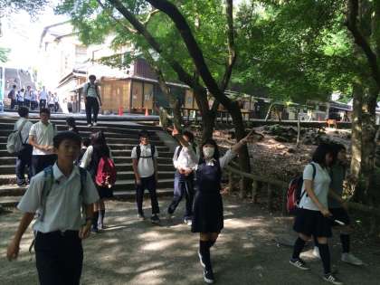 休んでいる鹿と戯れて、みんな楽しそうです。