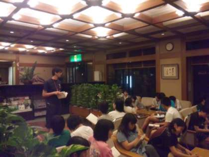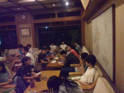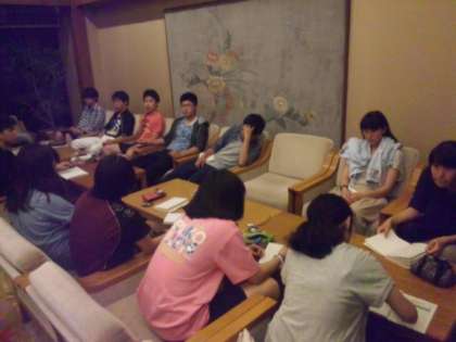 明日の予定、チェックポイントの確認や布団の片付け方についての連絡を真剣に聞いていました。