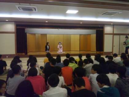 舞妓さんに来ていただき舞を見せていただいたり、質問に答えていただいたりした後、クラスごと写真をとっていただきました。(遠藤)