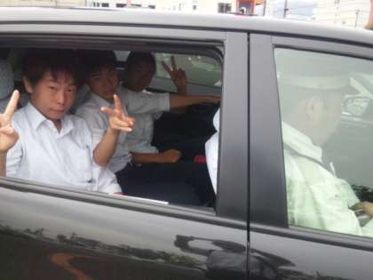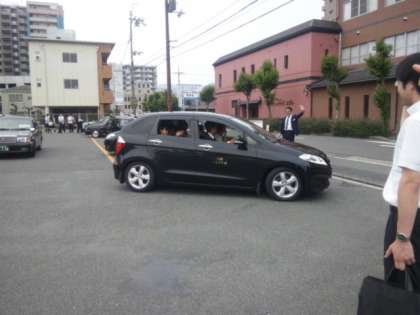 タクシーに乗って班行動のスタートです。(遠藤)