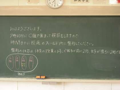 今日は月曜日、あと運動会まで一週間です。今日から朝練習が始まりました。7時40分から校庭で各クラス練習を始めました。グランドを走ってから、全員リレーのバトンの受け渡しを確認したり、クラスの大縄跳びを繰り替えし練習したりと、それぞれが工夫して取り組んでいました。(副校長)