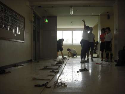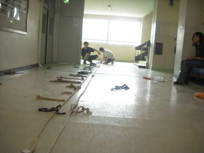 放課後、3年C組が大むかでの縄の調整をしています。朝練習から始まり放課後の活動まで、運動会にまつわる活動も増えてきました。がぜん雰囲気も盛り上がってきましたね。当日が楽しみです。(副校長)