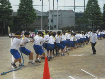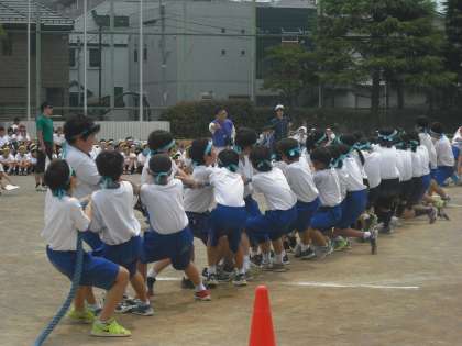はじめからの男女で綱引き対決です。綱はなかなか右へも左へも動きません。白熱のクラス対抗でした。A組が1年生を征しました。(副校長)