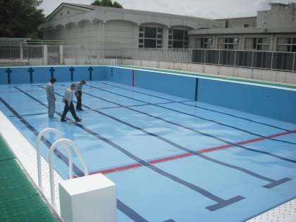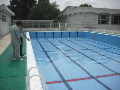 過日より行っていましたプールの塗装改修工事が終了し、本日検査を行いました。近隣のみなさまには工事に関してご理解・ご協力いただきありがとうございました。(副校長)