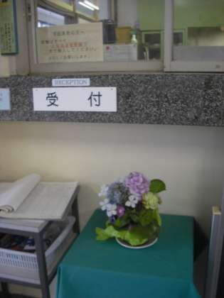 みどりのカーテンはゴーヤとキュウリとヘチマが同居しています。よくみてみるといろいろな実がなっています。また昇降口では紫陽花が生けてあります。主事のみさなんが季節感を味わってもらおうと整備してくださいっています。ありがとうございます。(副校長)