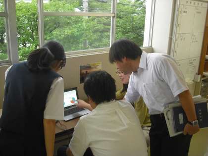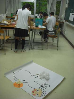 生徒会本部役員が放課後に活動しています。生徒会室では、役員の手により「くまざわ君」はデカパンから別の衣装に着替えのようです。また職員室前では、役員の生徒が「八ヶ条」のアンケート結果の集計について先生方に相談中です。いよいよ七月です。(副校長)