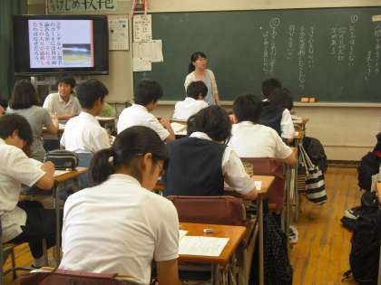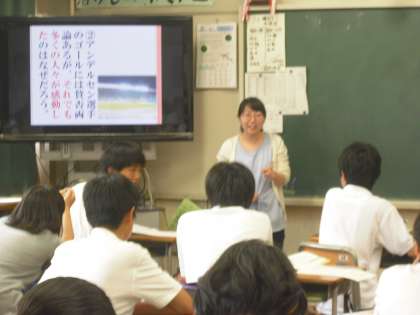 松本先生が道徳の授業で2年A組のみんなと考えています。最後まで走り抜いたアンデルセン選手を題材に、最後まで努力しつづけることに選手の役割を最後まで通したことなど、外見だけでない美しさについてみんなで迫っていました。(副校長)