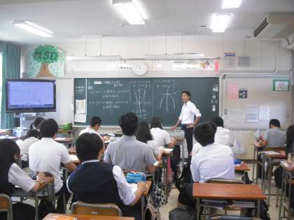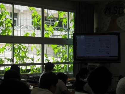 教室では2次関数の変域の学習です。yの最大値と最小値がどこのあるのか、グラフの概形から確認していました。原点を通るところがポイントですね。教室の外はみどりのカーテンがみんなを見守るように日差しを遮っています。(副校長)