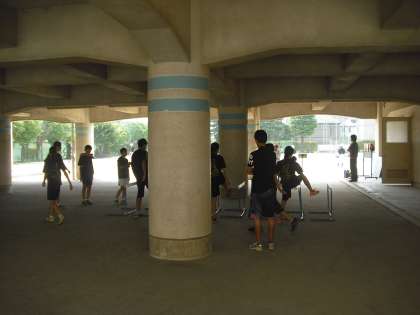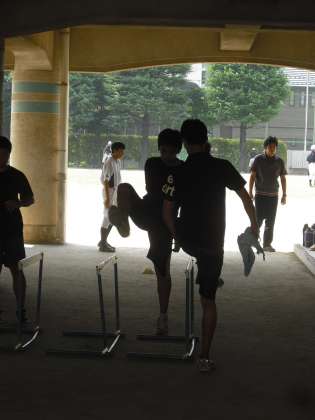 陸上部はプール下で練習中。今日は角田先生が一人ひとりのフォームを確認しています。体が動きを覚えるように練習を繰り返していきます。(副校長)