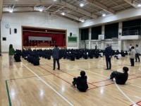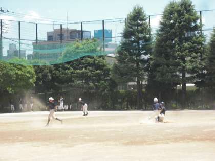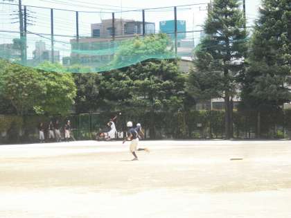 校庭で野球部が活動中です。今日の校庭は風があります。ゲームノックで金子先生が指導中です。実際の試合では送球のミスは命取りになることも!中継プレーを何度も練習しています。(副校長)