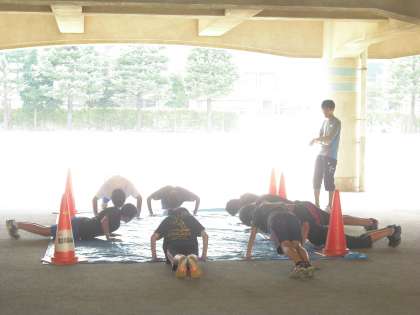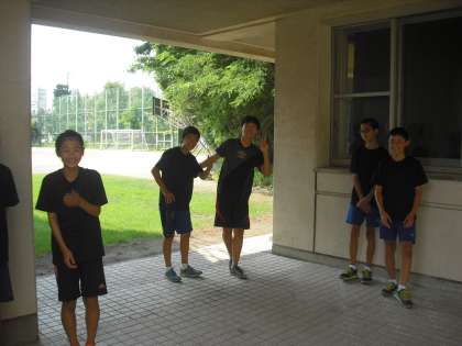 校庭で活動中です。プール下の日陰は、恰好の練習場所です。また芝生は涼風を運んできます。暑さ対策工夫をしながら部活動に取り組んでいますね。(副校長)