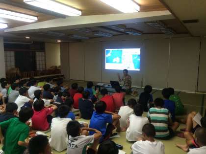 部活動合宿でやってきた東北で震災体験談を聞くことは、貴重な体験になるのではないでしょうか。練習の疲れも見せず、みんな真剣に聞いています。(佐野)