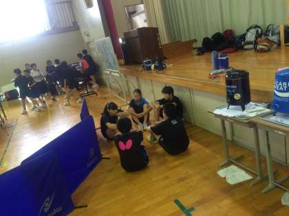 卓球部の午前の練習が終わりました。練習を振り返ってのミーティングです。休憩の後、お昼ごはんです。(佐野)