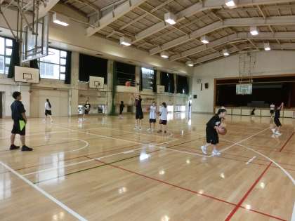 体育館ではバスケットボール部が活動しています。休み明けなので、男子はフットワーク中心、女子はドリブルやシュートといった基礎的なことを、みんなで声を掛け合いながら集中して練習しています。(遠藤)