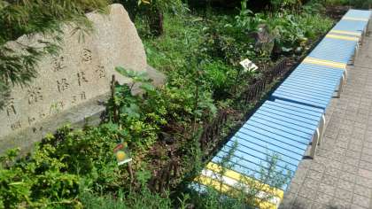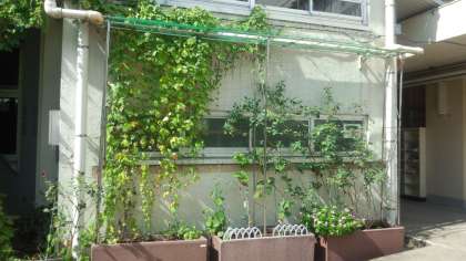 70周年記念植樹で果実のなる苗木を植えていますが、中庭の「ぶどう」「キウイ」のプランターの上に、学校主事の佐藤さんが「棚(たな)」を作ってくれました。弦がどんどん上まで伸びて、大きく育ってくれることでしょう。