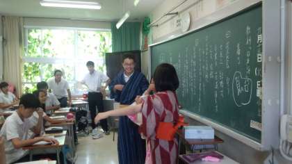 3年C組の授業「着る」で、浴衣姿を見ることができました。着付けは小林久美子先生がしてくださいました。昨日のあるドラマの最終回を思い出しました。