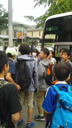 学校で出発式、バスに乗車しました。これから河口湖に向かって進みます。保護者の皆さまお見送りありがとうございました。(副校長)