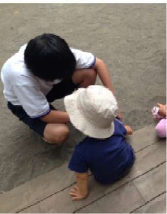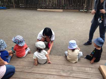 鳩ぽっぽ保育園です。これからお散歩に行くところです。くつを履いていってらっしゃい!!体験している生徒は、2人ともがんばっていました。(小嶋)