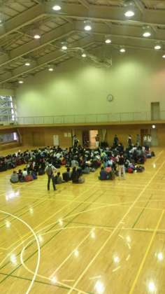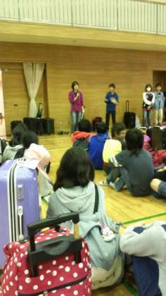 学園に到着しました。体育館で開園式です。2拍3日元気に仲良く過ごしましょう!