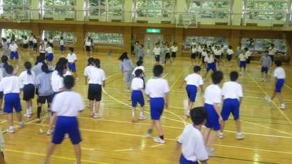 最後の試合は、クラス対抗です。一つのコートにクラス全員が入ります。ボールは2つ。白熱しています。(副校長)
