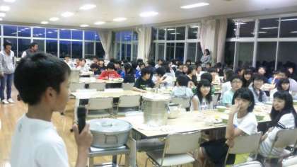 今日の夕飯は郷土料理のほうとうです。みんなで食べると話も弾みます。それでは、食事係さんの号令のもと、いただきましょう。(副校長)