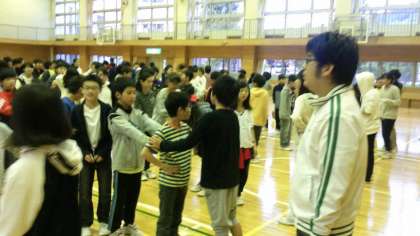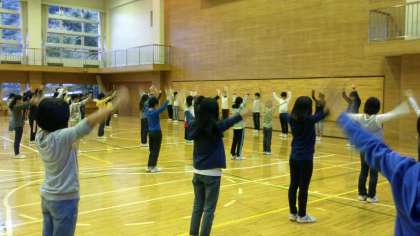 おはようございます!!雨は上がりましたが園庭の具合で体育館スタートです。整列・点呼も素早くなってきました。朝礼は全員集合、今日も楽しく活動しましょう。(副校長)