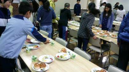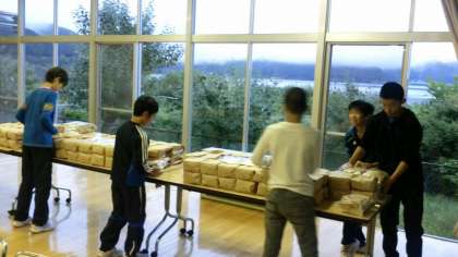 食事係さん、配膳中です。朝食と平行してお弁当もクラスごとに仕分け中です。今日はお弁当も活躍しそうですね。(副校長)