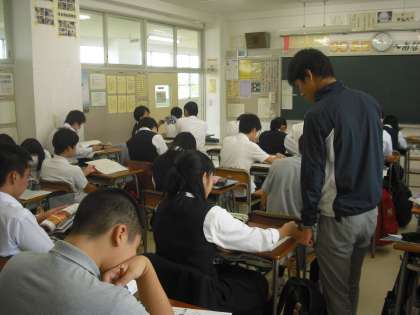 プリントを使ってまとめの学習です。ノートや教科書を見てこれまでの学習内容をまとめていきます。天体の動きなど日頃の生活体験とむずびつけて考えるとよいですね。試験も一週間前です。事前の学習がんばってください。(副校長)