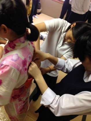 浴衣着付け体験では、実際に帯の結び方に挑戦しました。着物の調整や帯の強さなど、難しいなりに一生懸命に取り組みました。